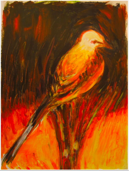 “Yellow Swallow Tailed Flycatcher,” the state bird of my home state of Oklahoma, surveys the wheat fields and cottonwoods in my mixed media drawing.