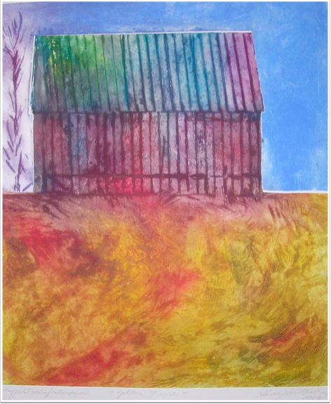 In my print, “Golden Fields” the blue of the clear sky, the movement of the wheat in the fields, are my inspirations.