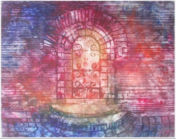 “Sacred Spaces,” drypoint/collagraph.