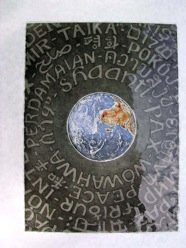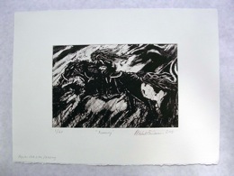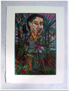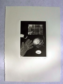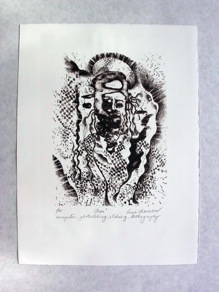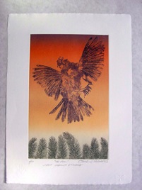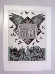 Judith Brodsky's "Zipporah and the Birds" is a digital construction employing photo etching with a rolled surface color. Zipporah, Moses' wife, is the subject of her print, part of a series about ancient heroines. Brodsky utilizes only images found through an Internet search. Zipporah means bird in Hebrew. Bird images, in combination with Sumerian seals, middle Eastern oil lamps, and foliage/bird decorations from medieval art are recombined, transformed.